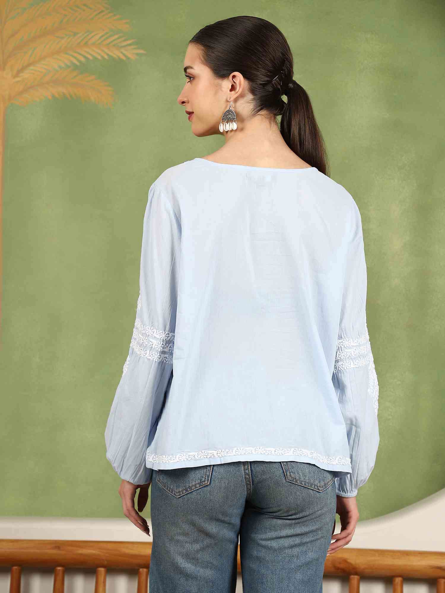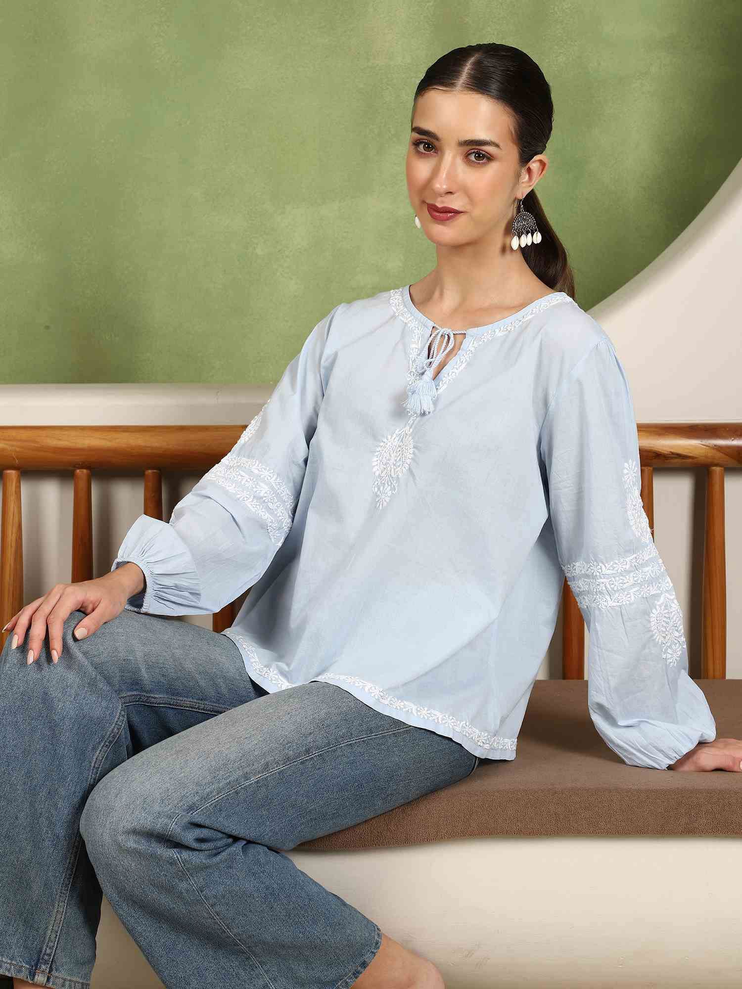 Aria Chikankari Top with White Thread & Balloon Sleeves – Blue