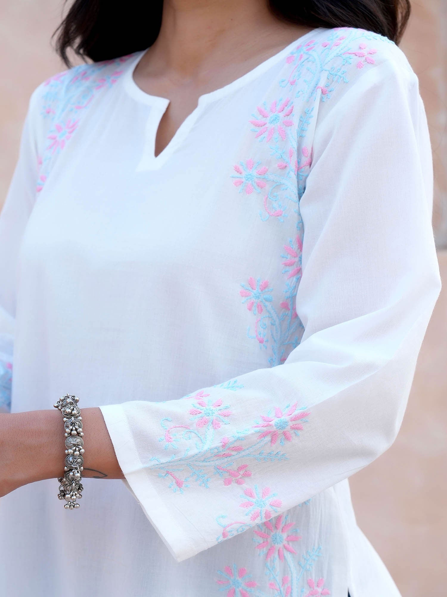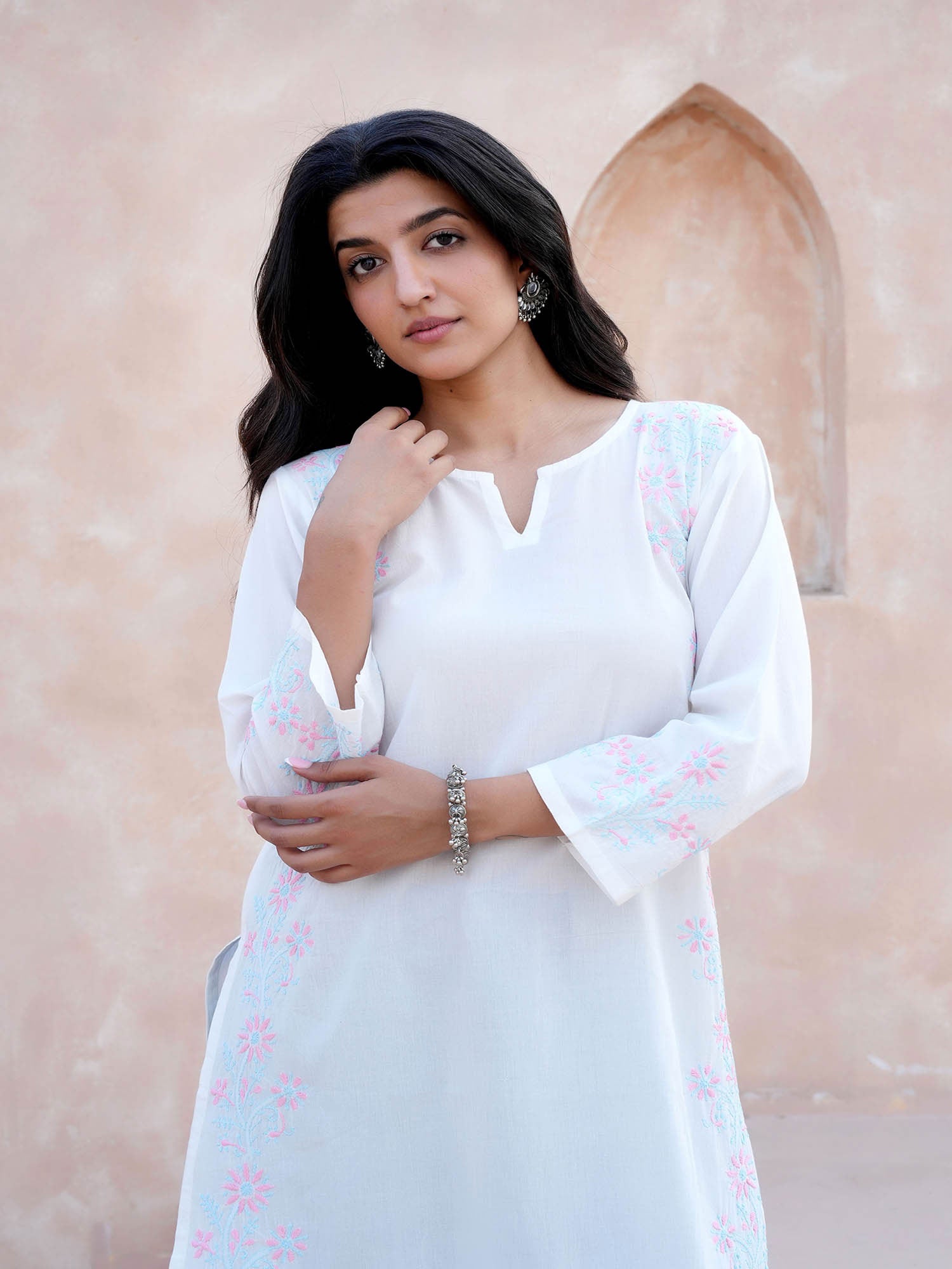 Jivika Pink & Blue Embroidery Chikankari Kurta – White