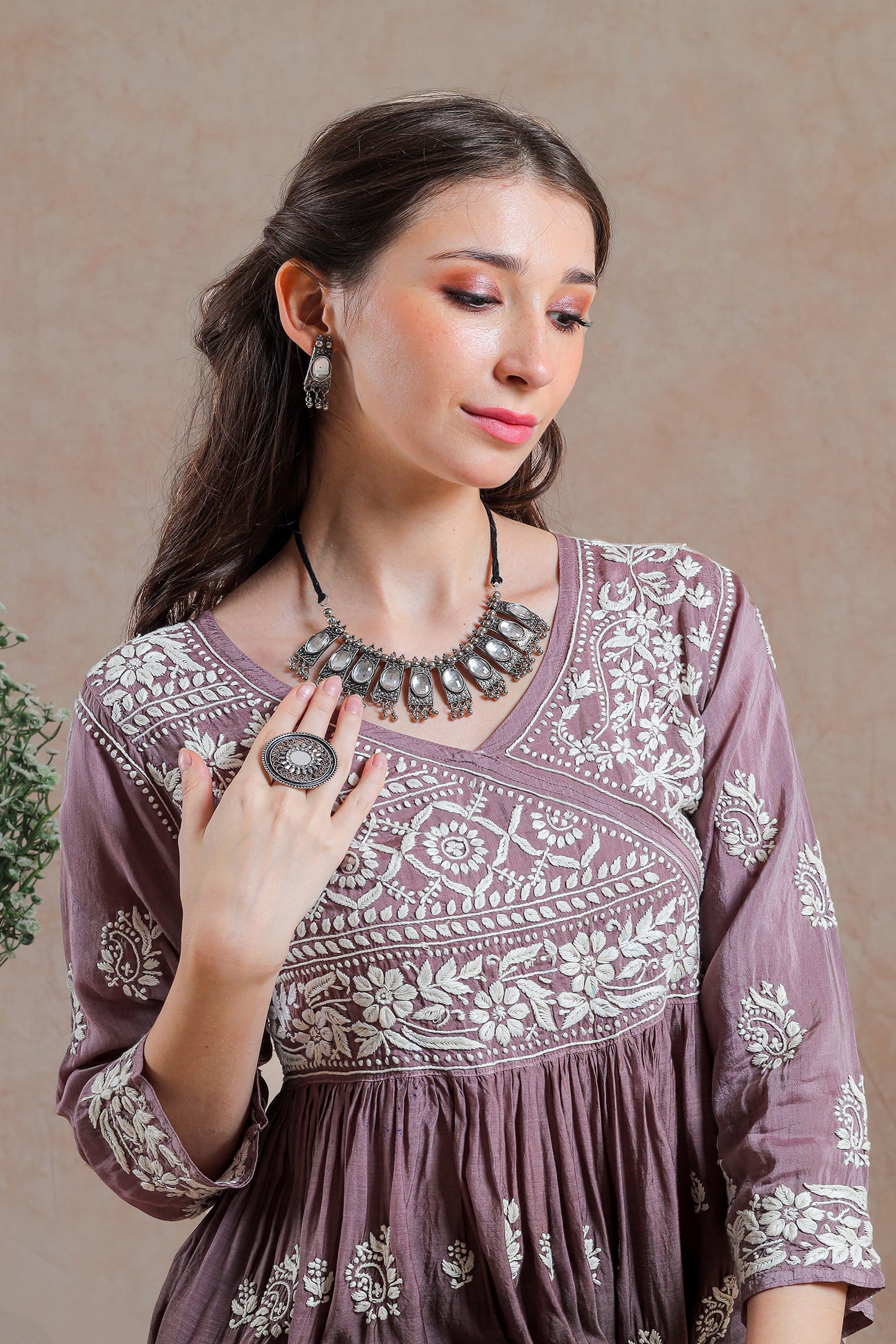 This Muslin asymmetrical yoke frock style kurta with pants offers a perfect blend of modern style and traditional charm. the intricate white chikankari detailing enhances the kurta’s charm, offering a subtle yet sophisticated touch, Paired with comfortable pants, this esemble is both chic and versatile.