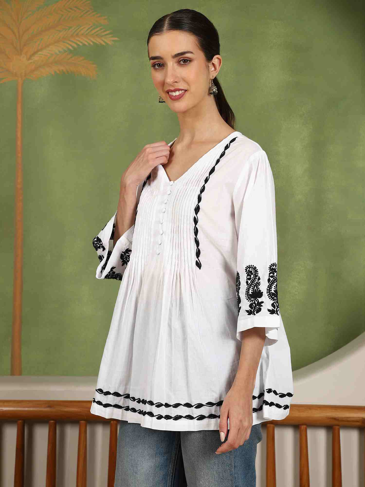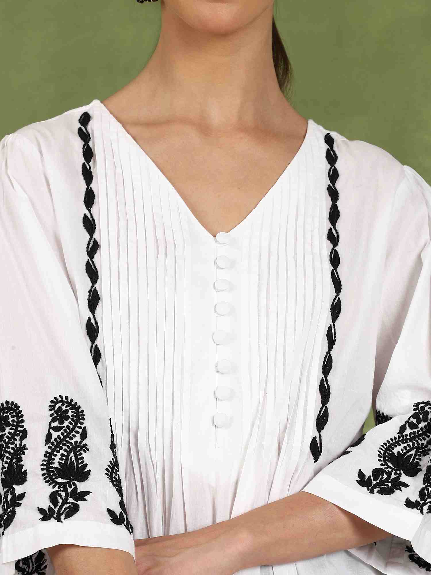 Elani Chikankari Top with Black Boota & Bell Sleeves – White