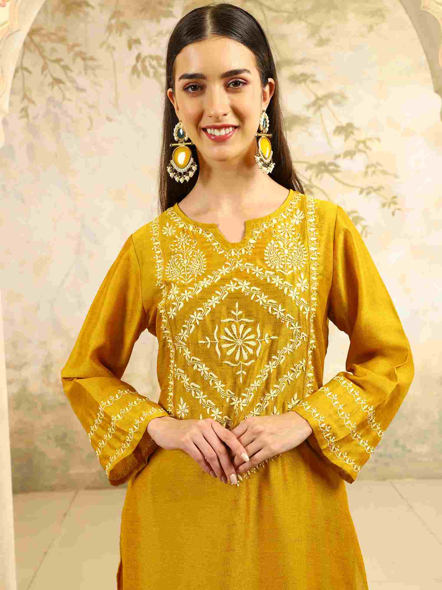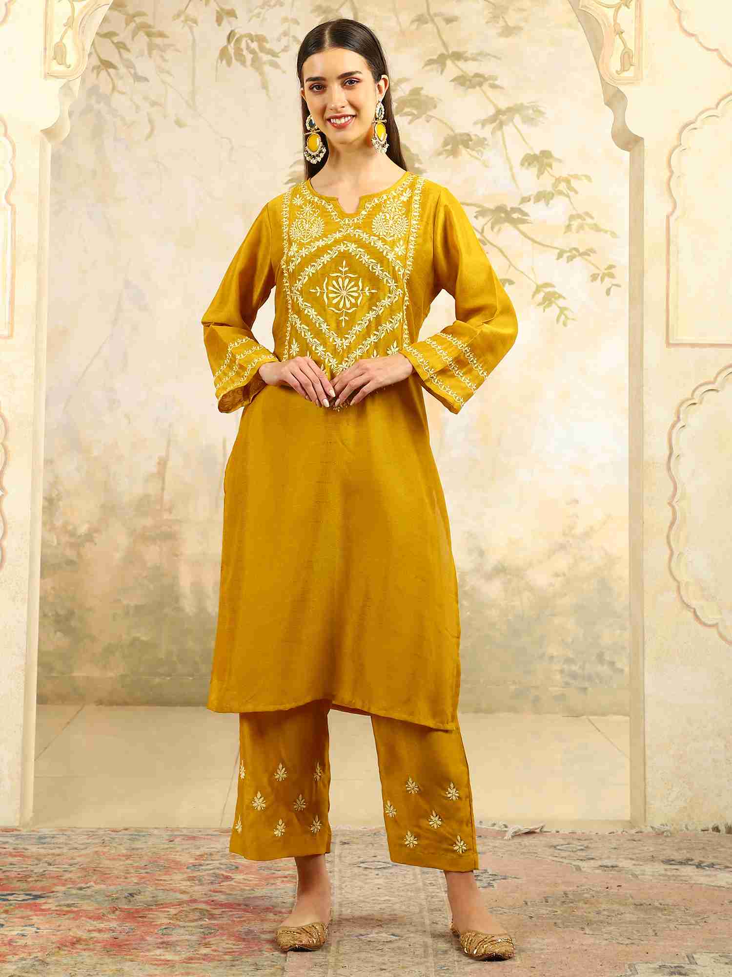 Ishani Yellow Chikankari Kurta Set with Butter Yellow Yoke – V Neck