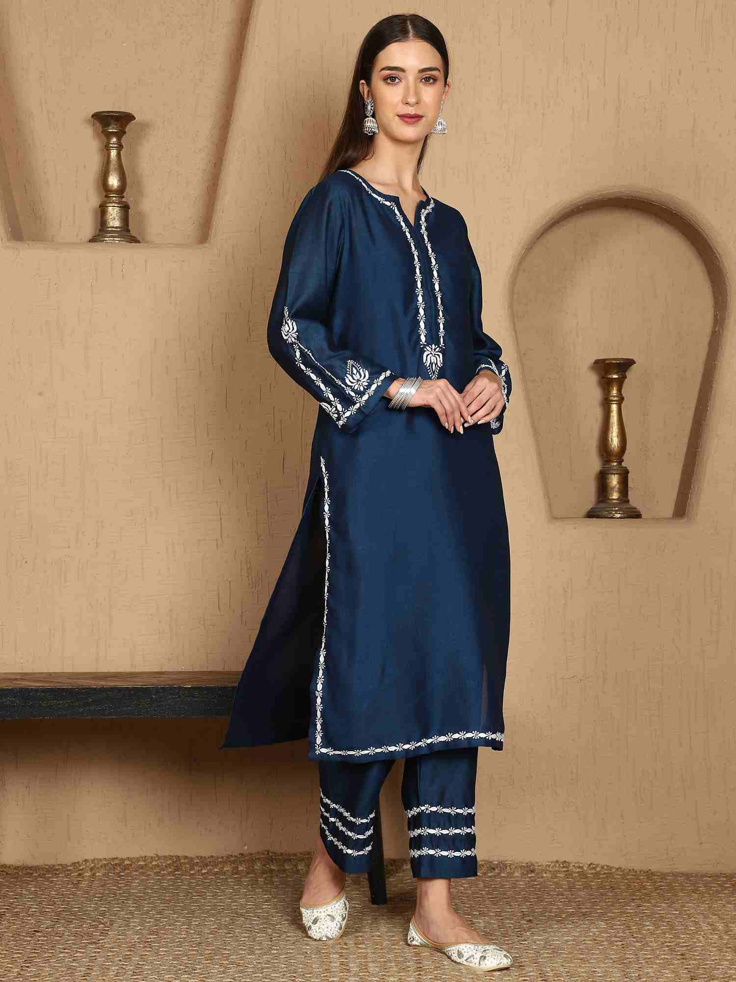 Kiara Blue Chikankari Kurta Set with White Thread – Notch Neck