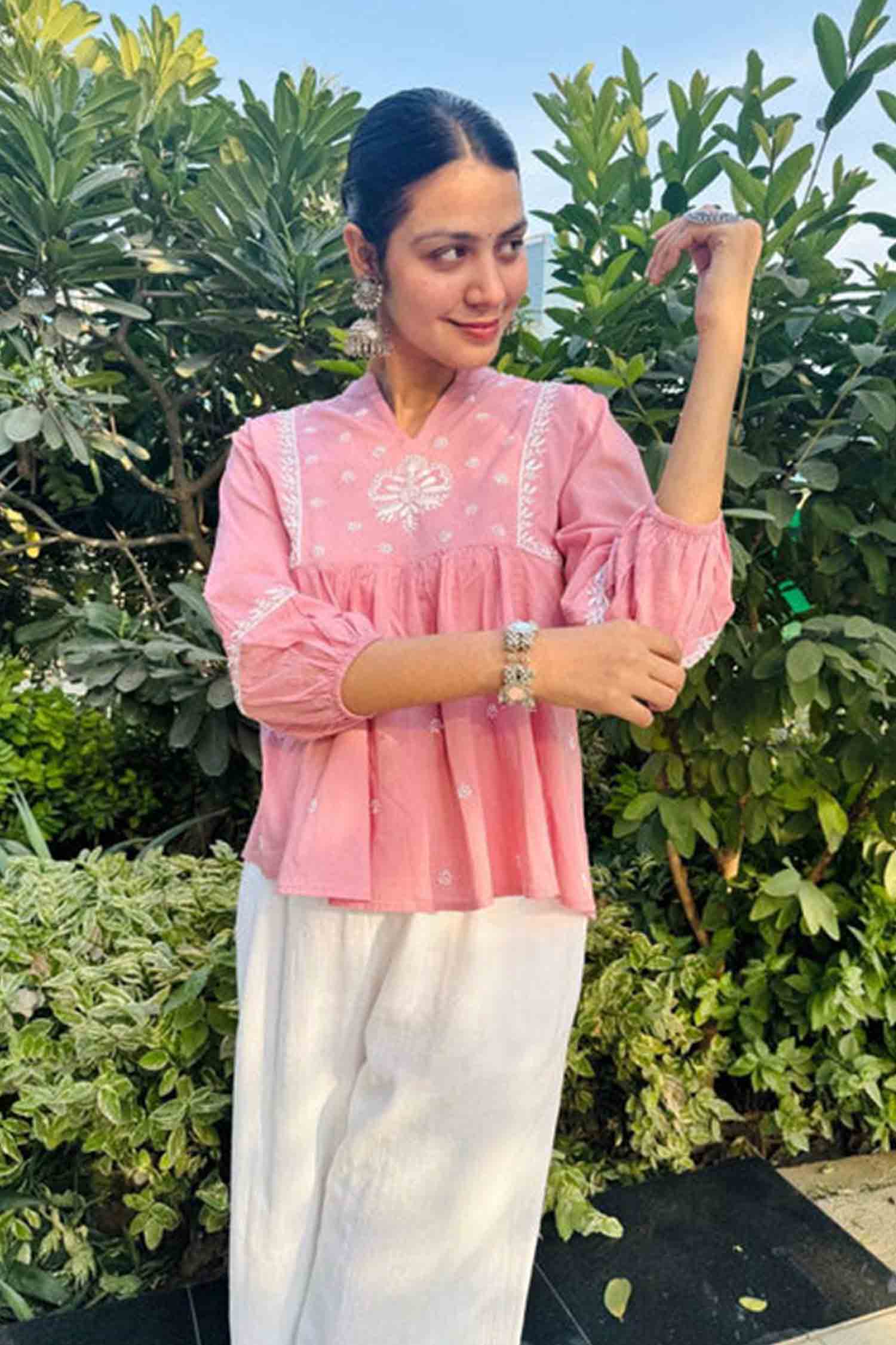 Cotton is the king of fabrics for a reason. The pretty pink top with chikankari detailing enhances the top's charm. Pink colour is so soothing during any weather and also is the perfect attire for any formal occasion and is highly sophisticated.